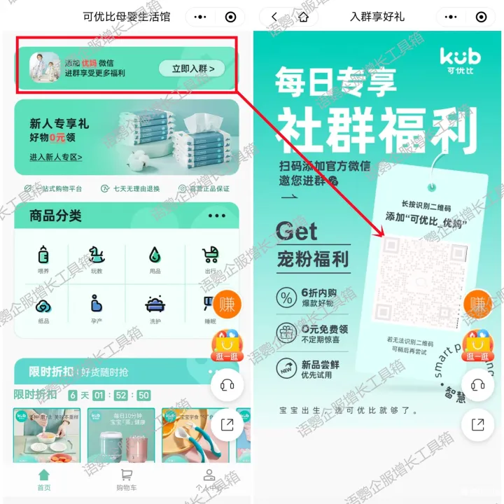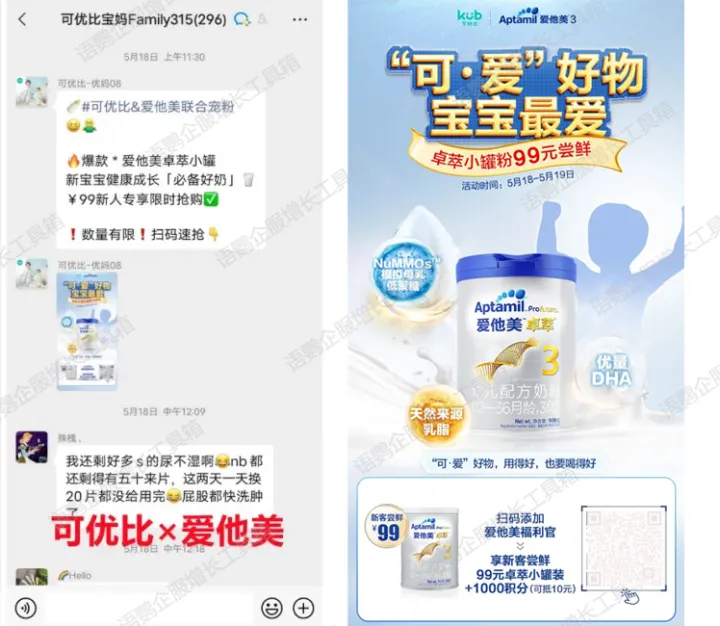 要问哪些类别的社群最活跃?答案一定有母婴。妈妈群体天然具备强分享欲,尤其是当话题涉及育婴时。可优比(母婴品牌)裂变月均新增用户高达300%,非常值得其他品牌学习和借鉴。今天以可优比为例,语鹦企服跟大家分享一下母婴品牌社群裂变应该怎么做?