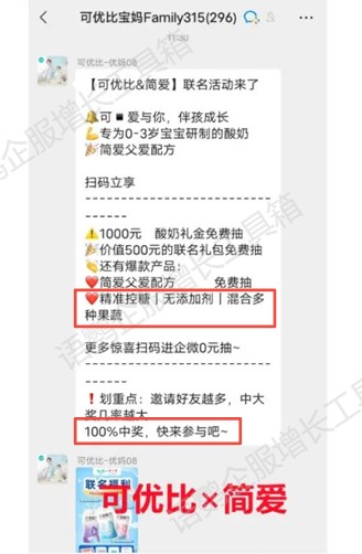在社群宣传文案中,除了列出奖品清单外,还突出强调了奖品的价值点(精准控糖|无添加剂|混合多种果蔬),更能突出奖品的高价值感。此外,文案还精准传达了“100%中奖”这个利益点,更具煽动性。品牌在设计传播话术时,不妨借鉴可优比的做法,把“利他”的中心思想最大程度地表达出来,提高用户参与积极性。