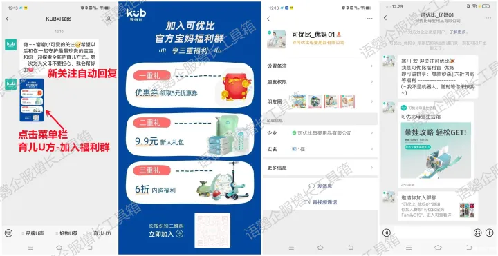 以上就是《可优比社群裂变案例拆解》的相关内容了,很多母婴品牌都可以复用可优比的裂变玩法。但品牌的调性和需求各有差异,建议重点参考玩法逻辑,切勿生搬硬套。更多企业微信玩法,关注语鹦企服私域管家。