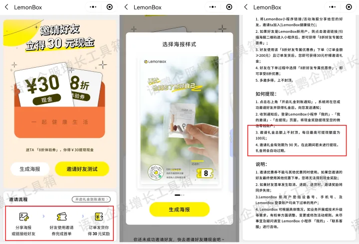 LemonBox小程序的高传播速度得益于完善的裂变机制,用户只需分享海报给好友,好友使用邀请券完成首单后就能得到30元邀请礼金,礼金总额上不封顶且可提现,活动力度大,为LemonBox带来源源不断的新用户。