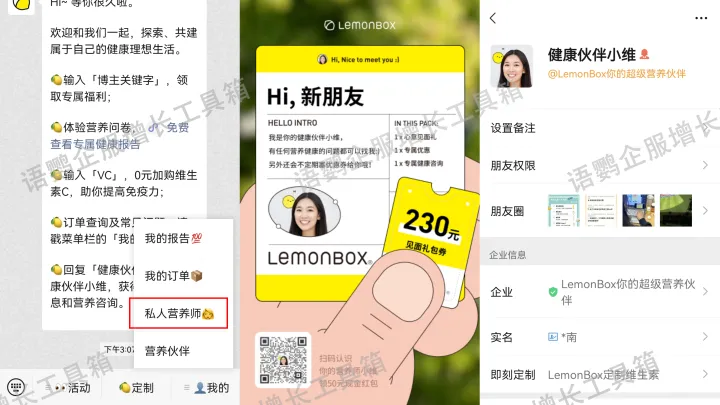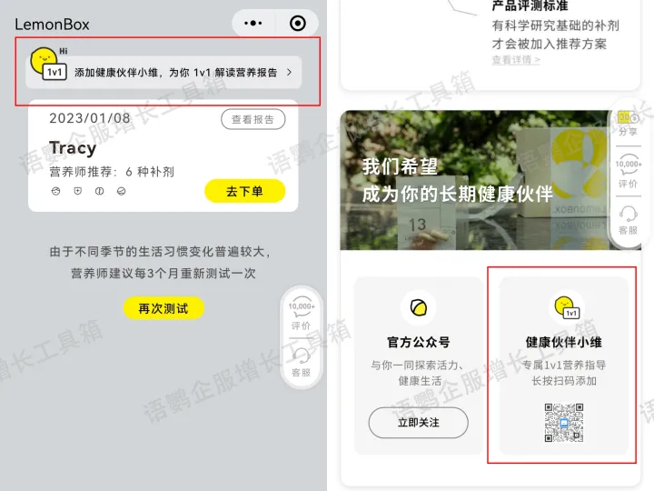 LemonBox作为高价、重服务的产品,加上用户需求具有私密性,更适合以企业微信一对一服务维系社群,而不是建微信群。因此,品牌在商品订单页、小程序问卷、公众号菜单栏都设置了添加企业微信入口,添加“健康伙伴小维”,将“AI专属营养师”升级为“专属营养师”。健康伙伴会一对一解答用户的问题,并提供专业的营养意见。