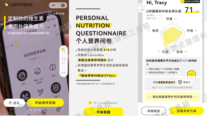 新用户进入LemonBox小程序后,首页会引导用户花5-10分钟填写“个人营养问卷”,智能生成精准全面的健康报告,再根据报告提供营养补给建议和推荐相关产品,为用户提供“AI专属营养师”服务。与普通的产品推荐相比,这种“定制模式”更能洞悉消费者的真正需求,精准地帮助用户解决问题,用户体验感好了,自然就更容易转化。
