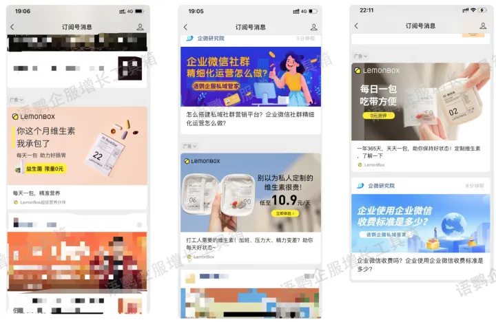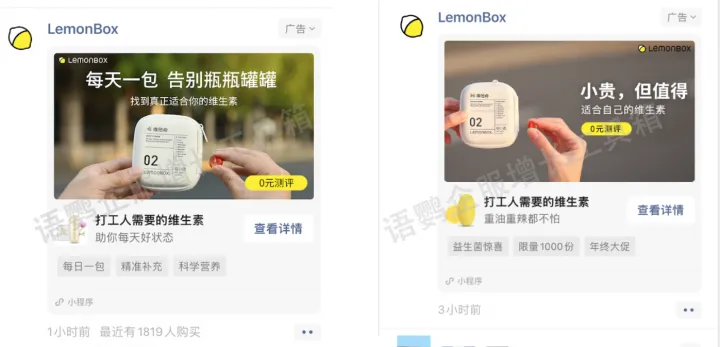 依托微信生态的互通性,LemonBox选择微信朋友圈做广告投放,用户可通过广告一键跳转小程序。在大数据的分析下获取潜在客户的用户画像,品牌采取定向投放广告策略。针对不同的目标群体推送不同的广告素材。例如针对女性,推荐“让素颜漂亮得像化裸妆”;针对上班族,则推荐“打工人需要的维生素”。广告还会将用户导流到企微、公众号、视频号等私域流量池,进一步运营转化。