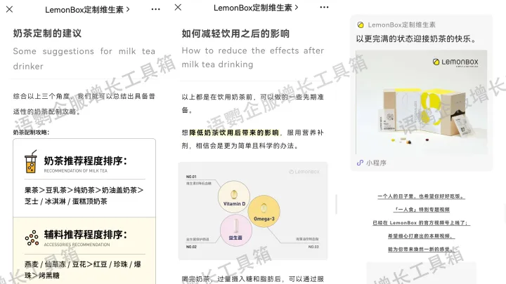 营养保健是一个需要对用户长期教育的行业,LemonBox打破“老年人才需要保健品”的刻板认知,选择年轻化、有共鸣的选题,在公众号和视频号中科普健康营养知识。LemonBox还很擅于结合当下社会需求做热点内容,达到营销目的,例如“控糖指南”、“低卡高甜奶茶攻略”等,通过内容提升大众认知,提供解决方案,文中穿插小程序入口,吸引用户主动关注并购买。