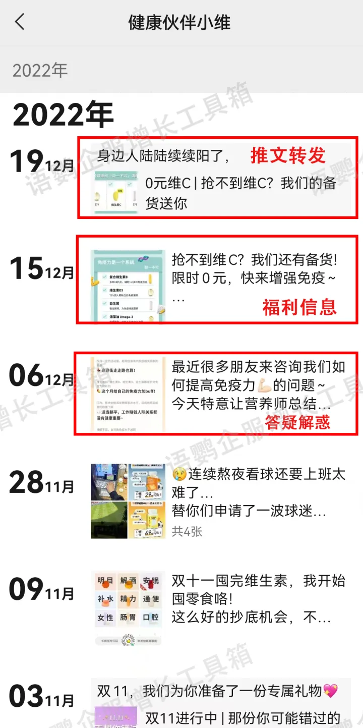 5. 作为高价、重服务的营养保健类产品,不建立一对多的社群,而是注重用户服务和用户体验,通过朋友圈运营和一对一服务解决用户营养难题,提供专业的营养意见,让用户体验专属感,提高对品牌的粘度
