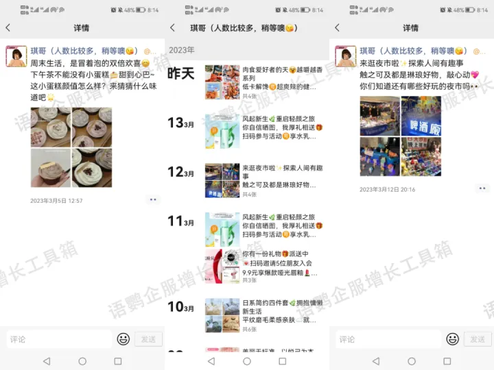朋友圈内容符合甜酷女孩的人设,不仅分享变美好物、品牌活动、异业优惠,还会分享“琪哥”的生活日常、穿搭分享,让用户感受到这是一个活生生的人,而不是一个宣传机器,朋友圈频率基本为一天一条。
