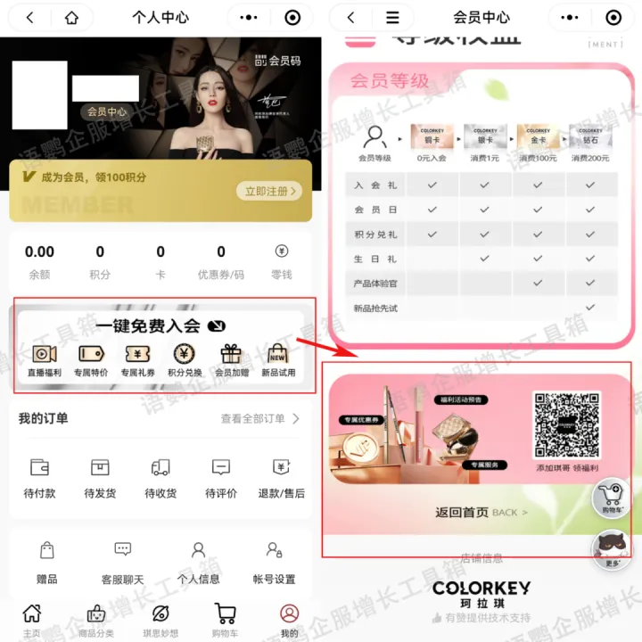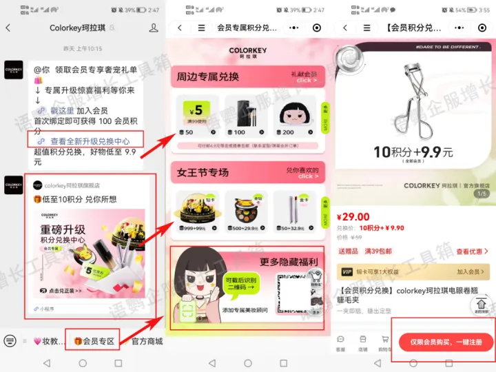 用户关注【Colorkey珂拉琪】公众号触发自动回复,与一般品牌不同,公众号不直接回复加好友引导,而是发送“会员积分兑换中心”,在兑换中心页面嵌入美妆顾问二维码。相当于先展示会员积分功能和福利,再自然引导加微领取隐藏福利,同时做到引导注册会员和引流企微。
