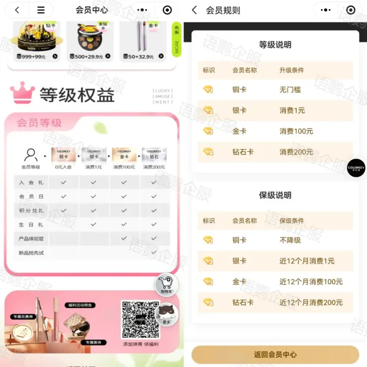珂拉琪为会员提供入会礼、会员日、积分兑礼、生日礼、产品体验官、新品抢先试五大权益,设置铜卡(0元入会)、银卡(消费1元)、金卡(消费100元)、钻石(消费200元)四个会员等级,分别享受不同程度的会员权益,整体升级门槛不算高。如果会员近12个月内没有消费满对应金额,则会降级,以此刺激会员复购保持等级。