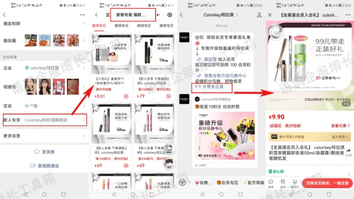 品牌可借鉴珂拉琪的做法,使用【个性化名片】功能,将“新人专区”、“新人福利”等小程序入口放到企微个人名片中,多一个进入渠道,就多一点转化概率。