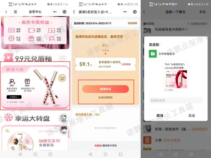除了企业微信引流,珂拉琪还针对会员做了裂变活动:邀请5位好友成为会员,完成任务即可9.9元购唇釉。活动引导会员分享珂拉琪小程序,实现会员裂变,完成小程序引流。