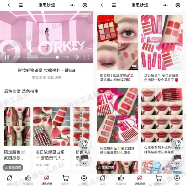 珂拉琪在小程序中开设“琪思妙想”内容板块,通过分享彩妆试色、化妆教程等内容,充分发挥彩妆的种草属性,引导新老用户下单同款,完成转化。