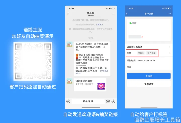 抽奖这一玩法门槛低、灵活度高,非常适合给私域用户发放福利。可直接使用语鹦企服【九宫格&大转盘抽奖】功能,设置好活动一键转发即可。还能搭配【员工活码】,添加好友自动发送抽奖链接,给用户一份见面礼。
