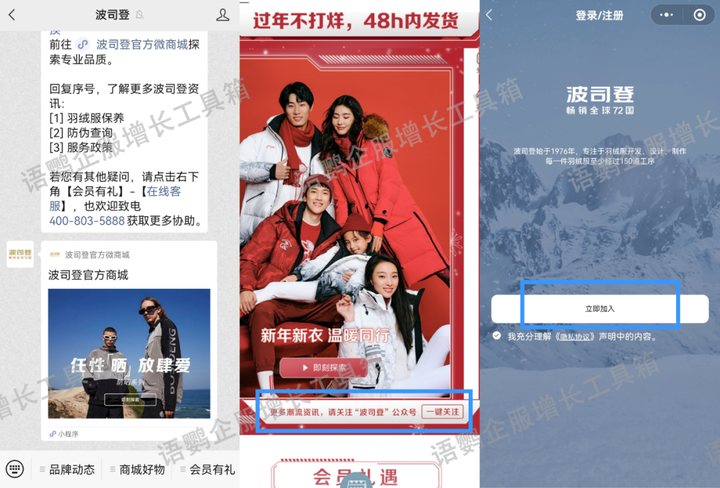 与此同时,波司登开通微信公众号并搭建小程序商城,用户关注公众号自动回复小程序,小程序中又埋入公众号入口,相互引流,打通私域流量池。用户点击小程序商城后必须完成会员注册方可进入,完成初步的品牌归属动作。