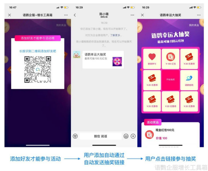 使用语鹦企服【员工活码】结合【九宫格&大转盘抽奖】功能即可实现这一引流路径,【员工活码】支持自动发送链接、小程序附件,用户通过验证后自动收到抽奖链接/小程序。也可将抽奖活动设置为【仅好友可参与抽奖】放到公众号菜单栏,完成引流。