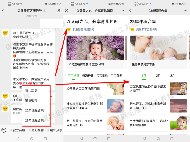 与单纯的私域卖货不同,贝肽斯十分重视内容输出。在公众号分享育儿知识、辅食视频、情感测试、课程合集等,内容垂直性强、价值高、针对人群明确,为宝妈打造了一个私域育儿知识库,大大提高用户的品牌粘度,降低取关率。