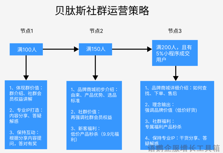 分节点社群运营:以人数为节点采取不同的运营策略,帮助用户循序渐进地建立品牌认知、品牌信任,熟悉后以福利作为见面礼引导用户完成首单;
