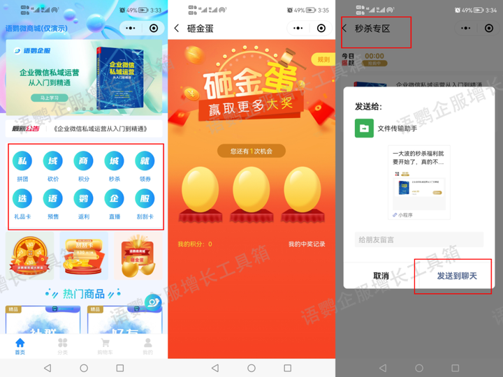 与贝肽斯特卖商城相似,【语鹦小商城】也内置多种营销玩法,包括秒杀、砍价、拼团、返利,还有抽奖、砸金蛋等互动活动,支持一键分享至社群/朋友圈,轻松做好活动宣传。