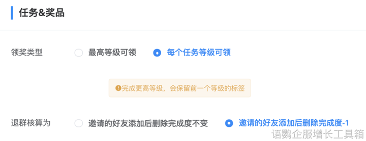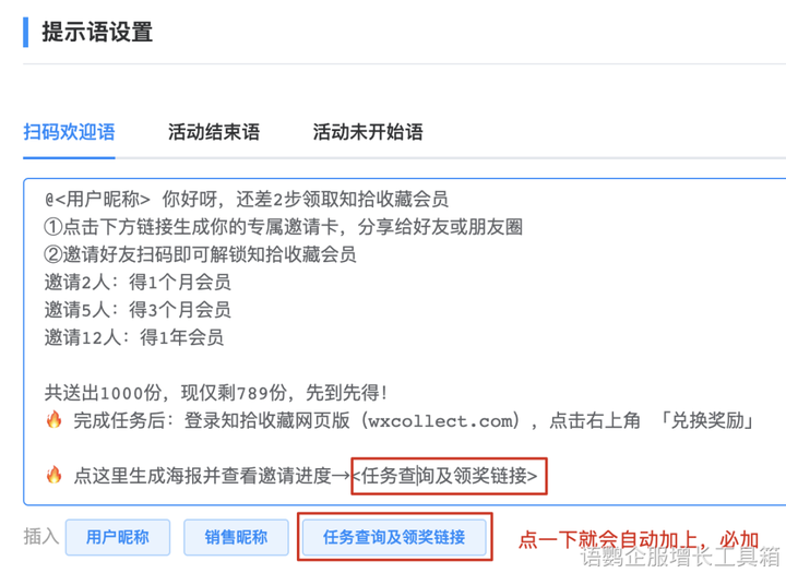 1)社群裂变:目前应用最见效最安全的裂变方式之一。企业可借助语鹦企服的「社群裂变」功能,设置邀请任务与奖品,吸引老客生成自己专属海报或链接,进行传播,不断邀请好友进群,以完成邀请任务,获得奖励,不断为企业带来客源。教育行业一般选择免费课、低价超值课、返学费等作为奖励。