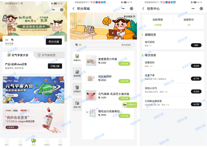 元气森林的会员注册、消费、签到都会赠送相应的积分,积分可在积分商城兑换商品,如元气周边、日用配件以及商城的卡券等等。如果积分不够的话,可以通过周期任务和单次任务专区积分,如:每日签到、完善资料、下单、添加企业微信以及订阅信息等去增加积分数。