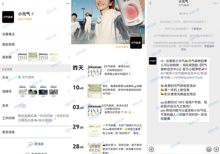 品牌升级之前,元气森林企业微信是真人出镜+简介,主打一个真实感和热情。如今元气森林品牌升级,主打一个品牌IP。