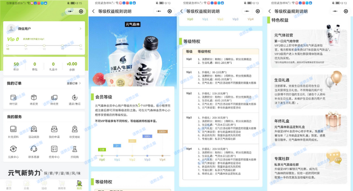 元气森林会员中心等级同样分为5个等级,但是从VIP0到VIP4,主要你消费1块钱,你就可以从VIP0升级到VIP1,也是比较能划分消费用户和非消费用户。