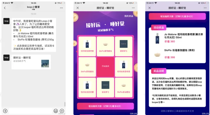 Loop律谱的降噪耳塞,是近几年流行起来的时尚单品。相比于几十块钱的普通隔音耳塞(海绵/蜡材质),Loop耳塞的降噪效果是显而易见的,还能保证不破坏音效,且绿色环保。为了进一步扩大品牌影响力,吸引更多新顾客,企业打造Loop小管家身份,让每个添加好友的客户,第一时间收到“6次抽奖”的福利,并以客户喜欢的礼品作为诱饵,吸引客户主动分享和传播,增加抽奖次数,从而实现企业裂变拉新的效果。