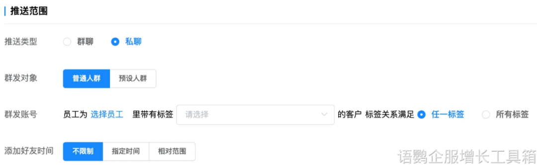 运营私域的过程中,商家需要定期对用户进行回访,在了解客户信息变动的同时,强化情感连接,输出产品卖点。通过语鹦企服的“定时群发”功能,商家可以制作专属于自己的营销日历,将内容进程可视化与自动化,架构与私域用户的强纽带。并且在分发时,商家还可以指定某一标签内的用户获取,从而达到定向营销的目的。