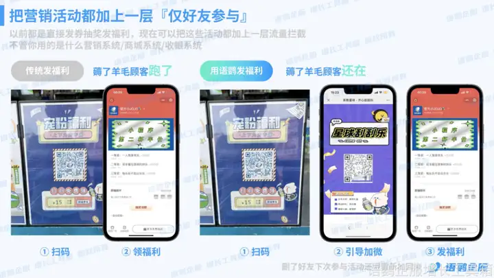 不仅如此,语鹦企服的【仅好友参与】功能还适用于发券、福利领取等场景,有效规避羊毛党。使用该功能后,到店的顾客加好友才能领取福利,这样一来,假如一个月内粉丝增长超1000,复合留存率达60%以上,那么到店客户的转化率将会很客观!