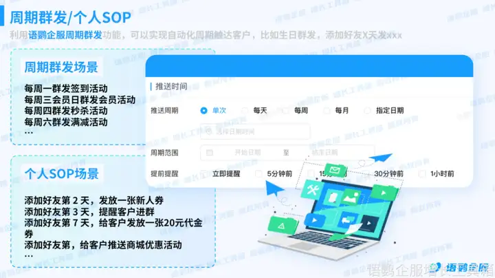 语鹦企服的【定时群发SOP】支持自动化周期触达客户,完美兼顾实用性和便捷性。企业可以利用语鹦企服的「周期群发」功能,设定每日、每周或每月的营销信息发送频率,并在特定周期内推送特定信息,确保营销活动有序进行,与客户建立稳定的交流频率,保持品牌在客户心中的活跃度,最终提升转化。