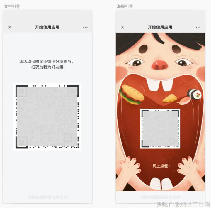 借助语鹦企服的【仅好友参与】功能,企业可实现加微点餐!当顾客未加企业微信访问时,会引导添加企业微信好友,已经是好友则直接点餐。门店可结合优惠活动,将二维码印制在点餐海报、餐桌、收银台纸巾盒等处,轻松引流,大幅提升获客效率。