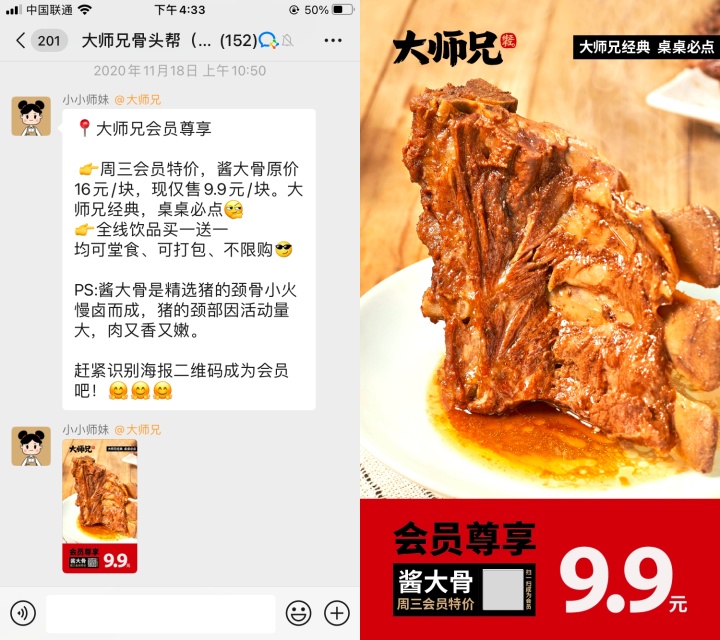 为了吸引更多的客户加入会员,「大师兄餐饮」在后来的会员日还加入了9块9的酱大骨,只要是在会员日当天,会员们便可以用9.9元购买原价的16元的酱大骨,酱大骨现在已成为他们的特色之一。并且随之而来的便是他们剧增的会员数量。