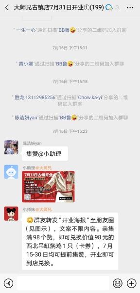 每个新店开业前,在企业微信客户群内,成员们还会收到企业微信一键群发的新开业活动信息,通过活动设置,让群成员裂变转发获取福利,从而快速圈一大波粉,不但能够刺激消费,让更多的人知道新店开业信息。