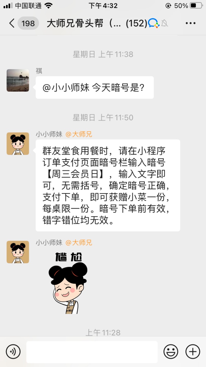 为了刺激客户进行消费,大师兄餐饮将每周三做为会员日,当天通过企业微信社群里面的小程序下单时填写暗号“周三会员日”,到店即可免费领取小菜一份,并且每周的小菜还会进行更换。