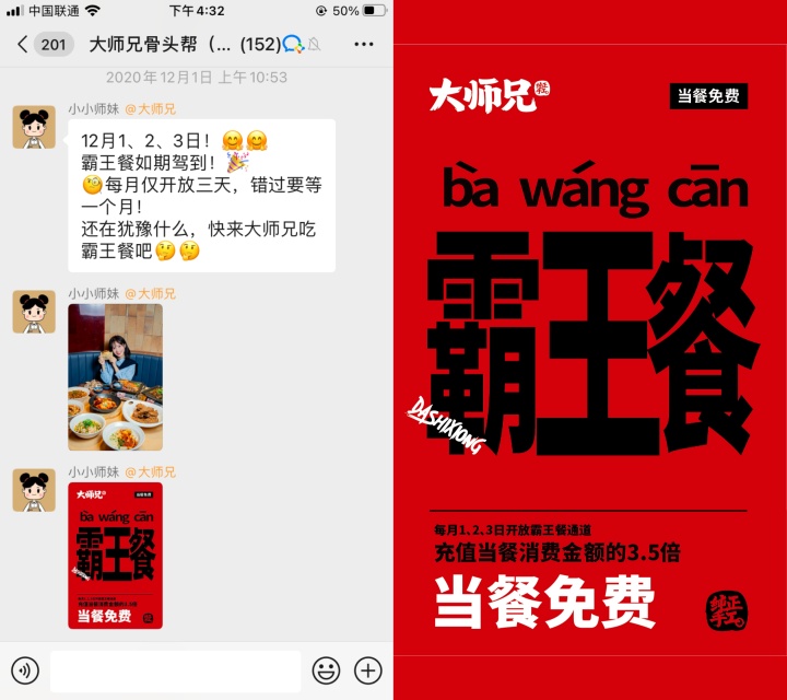为了吸引更多的客户到店消费,「大师兄餐饮」还推出了每月霸王餐活动,在每个月的1、2、3号,到店充值当餐消费的3.5倍金额,即可当餐免费吃。在这么巨大的福利下,你想不充值都难,但是你要知道当会员里面有余额时,会一直触动客户,更加刺激客户的消费心理。