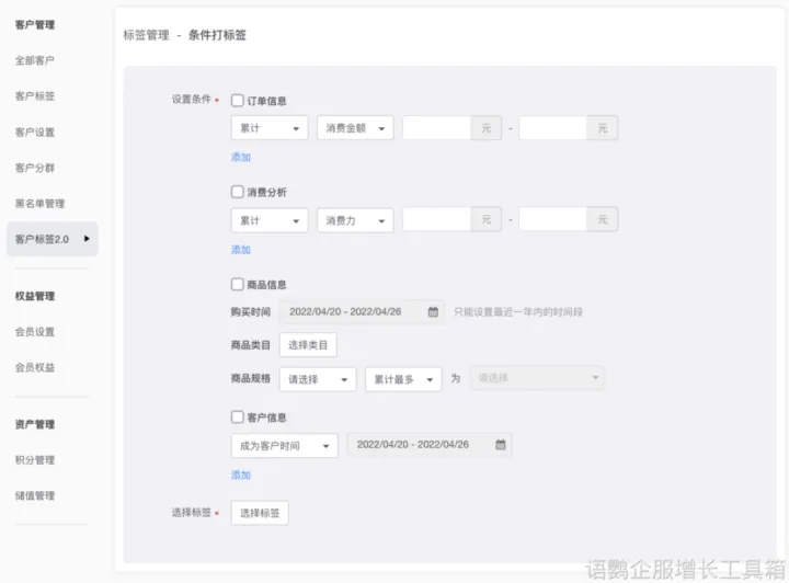 另外,做好标签细化分类也是精细化运营的前提,尤其是有线上商城的鞋服品牌,可使用语鹦企服【条件打标签】功能,通过开放API接口连接第三方外部系统(微商城等),根据设定好的自动打标签规则对用户的消费行为打标签,例如历史累计消费次数、消费金额、消费偏好等。再根据不同类型的用户推送相应的活动和内容,击中用户需求点,提高转化几率。