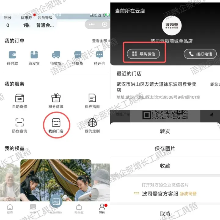 另外,小程序商城和公众号也是必不可少的引流阵地。许多鞋服品牌都会创建自己的公众号,定期输出穿搭指南、新品介绍、活动宣传等优质内容,用户关注公众号自动发送进群海报,或在小程序的浮窗、弹窗、会员页面嵌入“加好友”入口,以“爆款抽奖、新品社群专属优惠”等作为钩子,吸引用户扫码添加。如果品牌有大量分店,还可将添加好友入口与附近门店推荐相结合,让用户更好地了解门店信息,如波司登就将导购微信嵌入在了门店指南顶部,方便客户沟通。