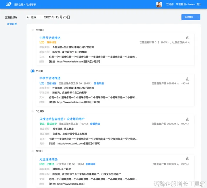 当内容板块较多时,往往容易出错,可使用语鹦企服【定时群发SOP】功能,做好内容规划,提前设置好朋友圈/社群内容和发送时间,到点提醒员工一键发送,避免出错。