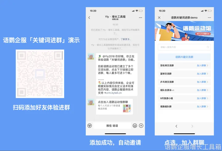 有的企业在线下布有很多门店,这些线下门店相当于庞大的公域流量池,这个时候企业可以从线下渠道将客户集中到企业私域流量池进行运营。另外,要想精准引流粉丝可以借用语鹦企服的「关键词进群」,把同一爱好/需求的客户统一运营,有助于话题的产生,增长群活跃度,更快捷地打造门店的精准流量。
