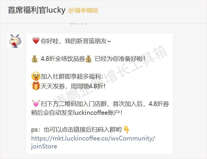 比如瑞幸咖啡的IP人设就是首席福利官lucky,lucky的二维码会放置在各个门店的台卡上或者人形立牌、海报中,门店的员工会以优惠券为利益点引导用户扫码添加。