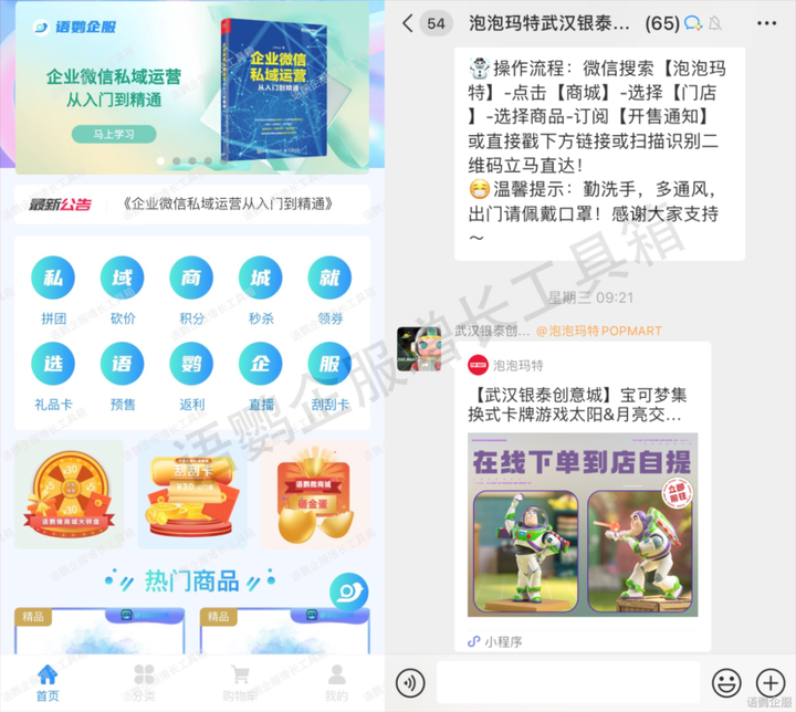门店可以利用社群开展半价或者秒杀福利款,但是要求这些福利产品需要去门店自提。社群在做这些营销活动时,可以利用语鹦企服微商城。因为语鹦企服微商城特别注重私域的运营,同时还有各种营销活动,比如秒杀、团购、砍价、领券等形式,方便企业一键发送到社群,激起客户的消费需求。