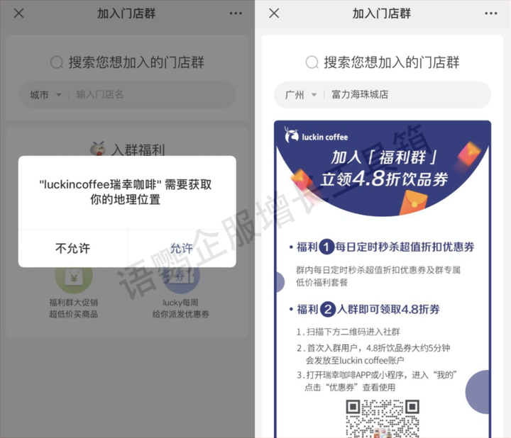 用户扫码添加完毕后会根据所在区域自动分配到运营人员的企业微信号中,而每个门店会根据区域消费者的情况设定优惠活动。其实从这个小细节中可以看出,瑞幸咖啡真正做到了精细化运营。