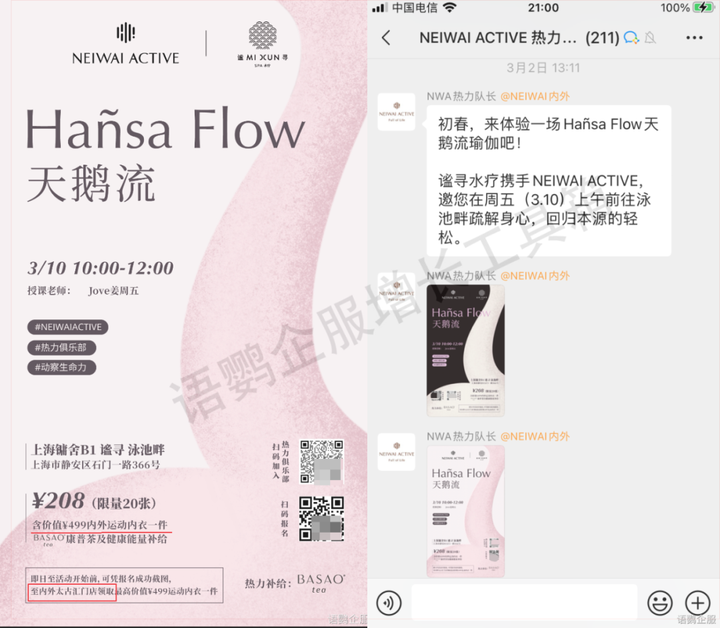 门店体验券的目的就是帮助门店进行引流,比如内外社群开展的天鹅流瑜伽活动,设立的产品钩子就是208元即可获得499元内外运动内衣一键,同时还能享受门店请来的专业老师教授的瑜伽课程。这里的208元就是门店设立的体验券,还有很多培训机构也可以开办免费的课程讲座引流社群客户,用免费的体验吸引消费者,激起消费者去门店的欲望。
