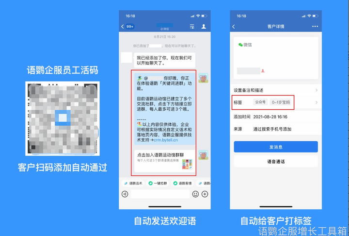 语鹦企服的「员工活码」可以实现自动通过好友,同时能自动发送欢迎语并给客户打标签,帮助企业对客户实现差异化运营和渠道统计。