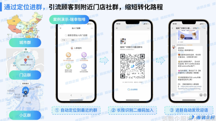 此外,不是每个行业都适合做社群,例如婚嫁服务、整形医院、汽车门店等客单价较高的就不适合做社群。而美妆专柜、品牌零食门店、茶饮店则更容易通过社群转化,可借助语鹦企服【定位进群】功能,用户扫码自动定位到附近门店,引流到店更便捷。