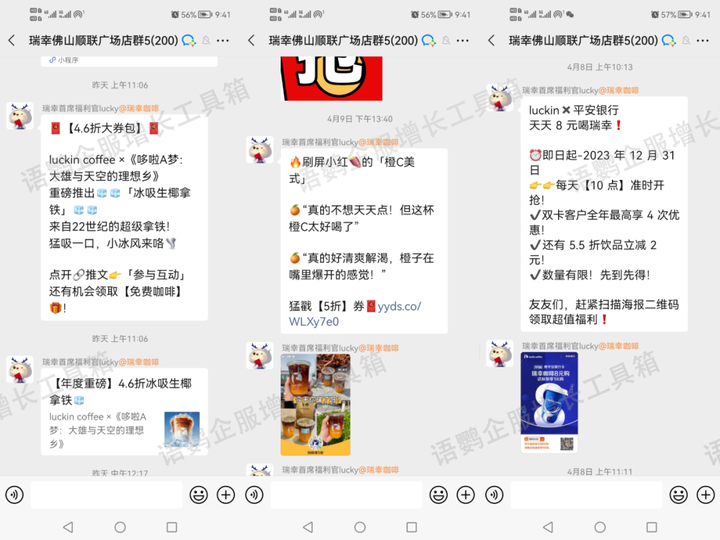 对于产品客单价低、消费频次高的实体店而言,社群更像是用户获取优惠信息的窗口。门店利用语鹦企服【定时群发SOP】功能定时提醒员工一键推送福利信息、优惠券,很多用户进群后不发言,但需要的时候会领取优惠券到门店使用。