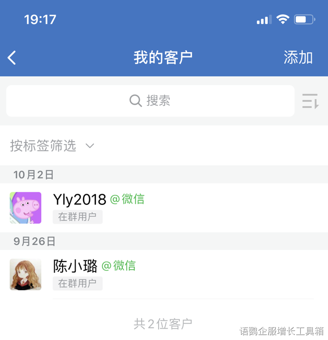为了进一步了解用户的需求,可以运用语鹦企服的「在群/不在群批量打标签」功能,看他是否在群聊中,筛选出其在哪个群聊中,并进行标签备注。