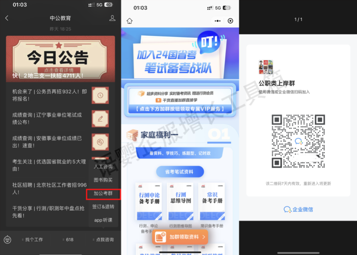 比如在中共教育的公众号里面设置了咨询通道,接着会通过很多福利,比如省考笔记资料等吸引用户加入群聊领取资料。那么我们知道,入群二维码不可能永远有效,为了解决这个问题,我们可以利用语鹦企服的「无限群活码」,首先第一个优势就是二维码永远有效,再次就是「无限群活码」可以无限建群,这就帮助很多企业解决了二维码时效性的问题。