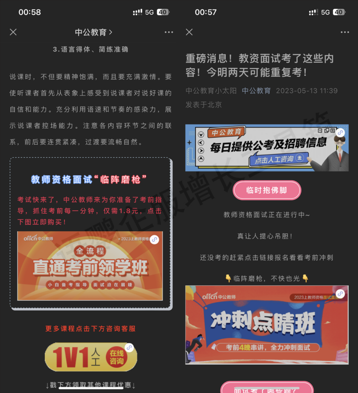 比如中共教育在教资面试前会总结好考试相关知识点并发布到自己公众号里,同时还会搭配福利“1.8元即可获得考前辅导冲刺班”附在文章最下方,引导用户购买。这其实就是最直接的通过福利引导客户进入自己的私域流量池。