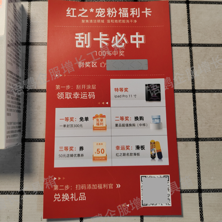 有网店的品牌可利用包裹卡做刮刮乐抽奖,引导用户刮奖后添加企微领奖,进入私域流量池。