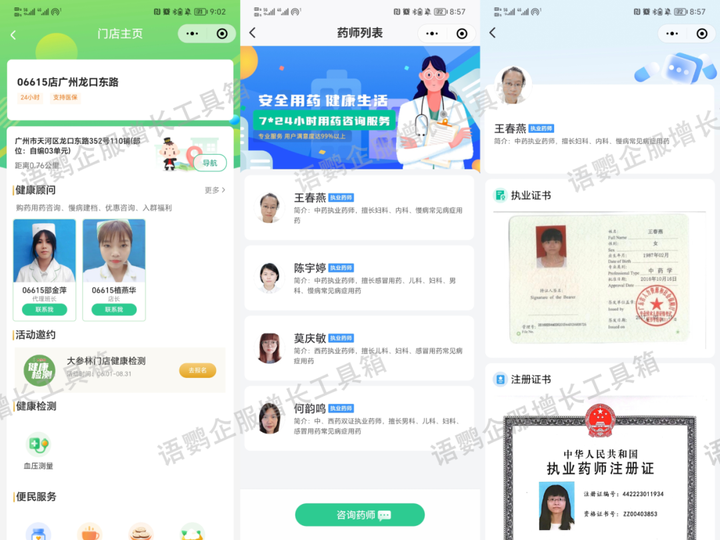 例如在药店/大药房放置KT板、台卡、电子海报等物料并嵌入语鹦企服【员工活码】,设计“加好友领券/送口罩/送止血贴”、“扫码享受限时免费用药咨询服务”、“扫码领取营养师服务体验机会”等作为诱饵,吸引用户加企微,设置自动通过验证并发送领券/领取服务链接。